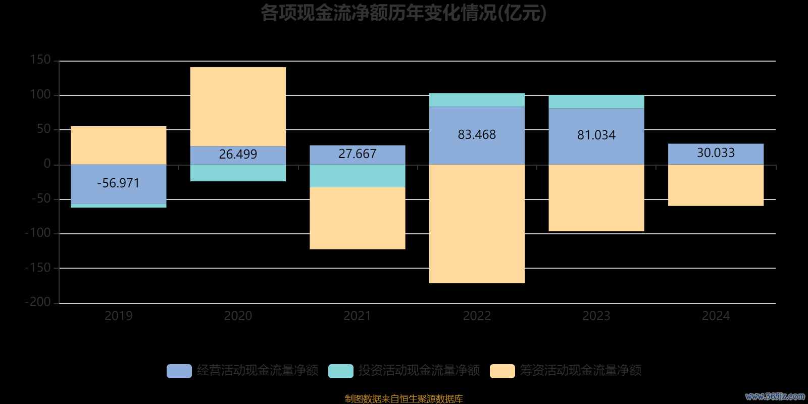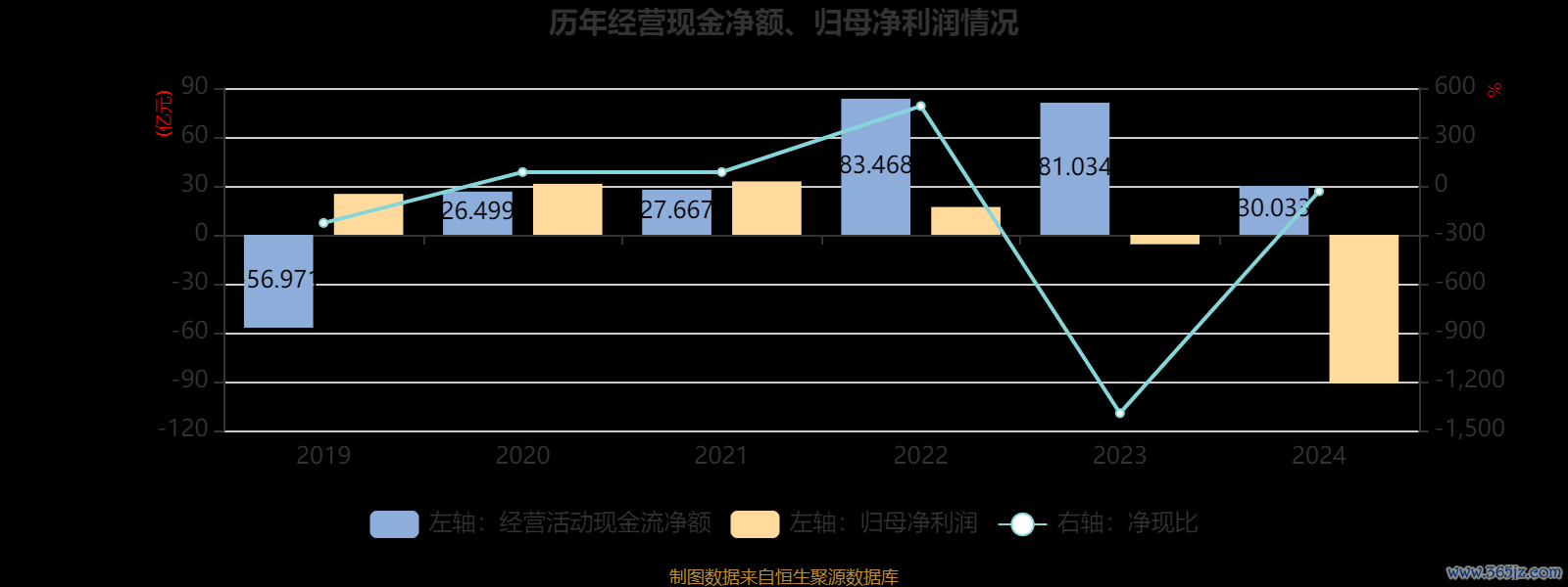 2024年,公司经营活动现金流净额为30.03亿元,同比下降62.94%;筹资活动现金流净额-59.48亿元,同比增加37.01亿元;投资活动现金流净额-3404.4万元,上年同期为19.43亿元。